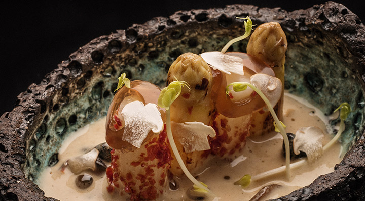 White sous vide asparagus on a St. George´s mushroom mayonnaise foam